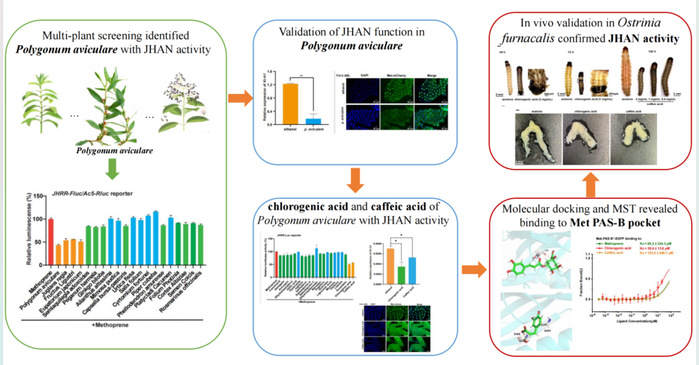 随着化学杀虫剂引起的环境污染和害虫抗药性问题日益严重,开发绿色、可持续的杀虫剂成为当务之急。保幼激素拮抗剂(Juvenile hormone antagonists, JHANs)通过干扰昆虫的生长发育和繁殖过程,以及对脊椎动物毒性低,展现出良好的应用前景。本研究通过在果蝇Kc细胞中利用保幼激素响应区(JHRR)驱动的荧光素酶报告系统,对多种植物粗提物进行高通量筛选,发现中药植物萹蓄(Polygonum aviculare)提取物具有显著的JHAN活性。进一步活性成分分析,鉴定出绿原酸(chlorogenic acid)和咖啡酸(caffeic acid)为主要的保幼激素拮抗成分。