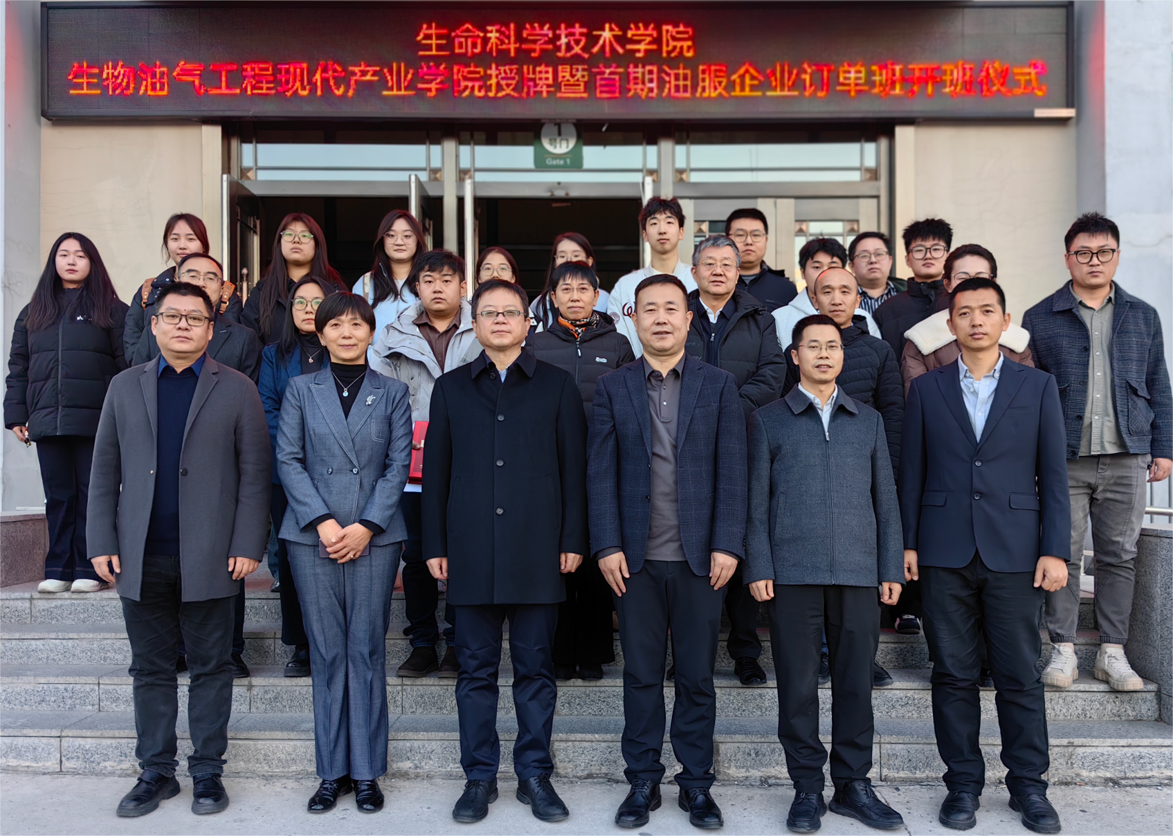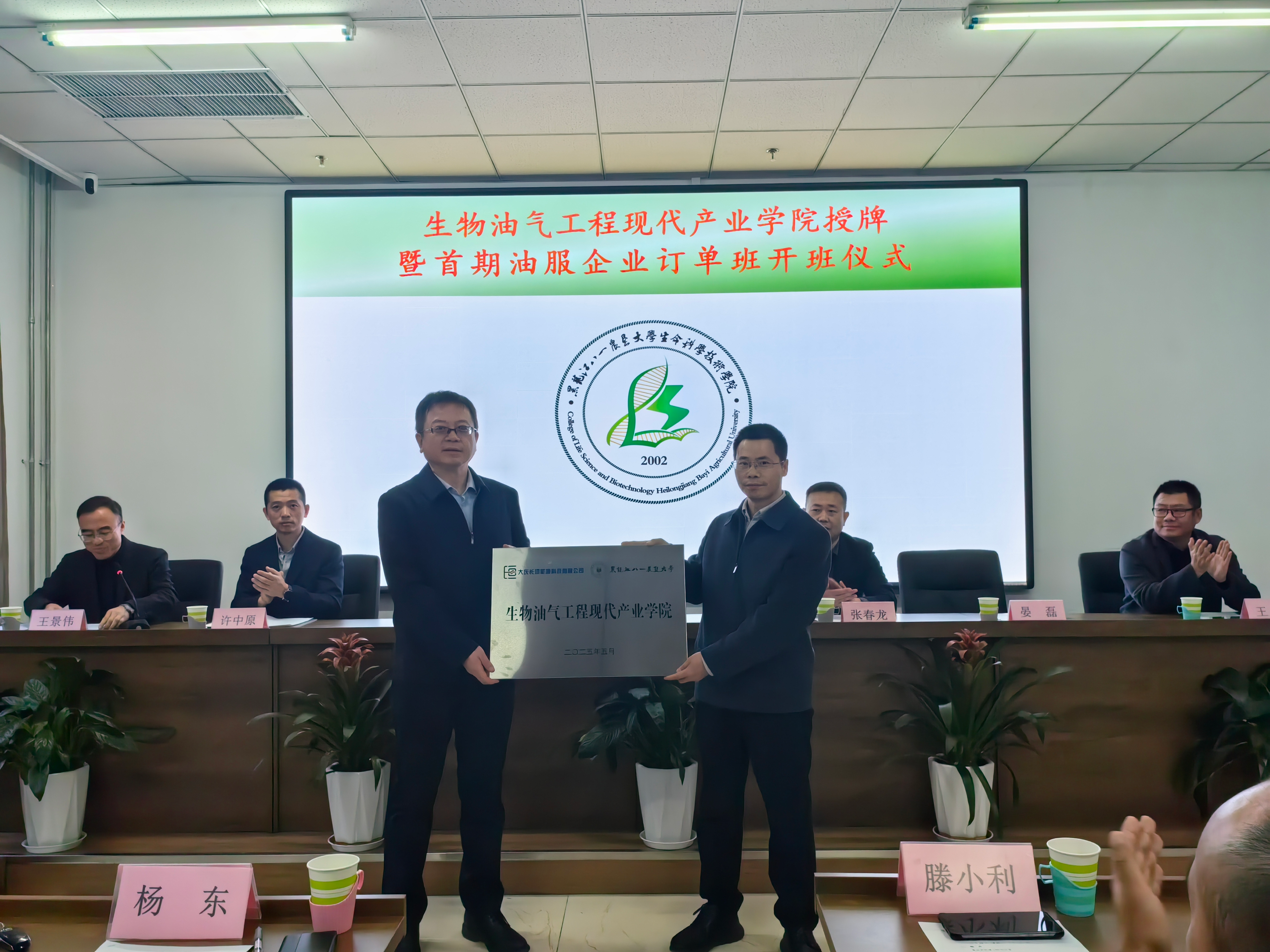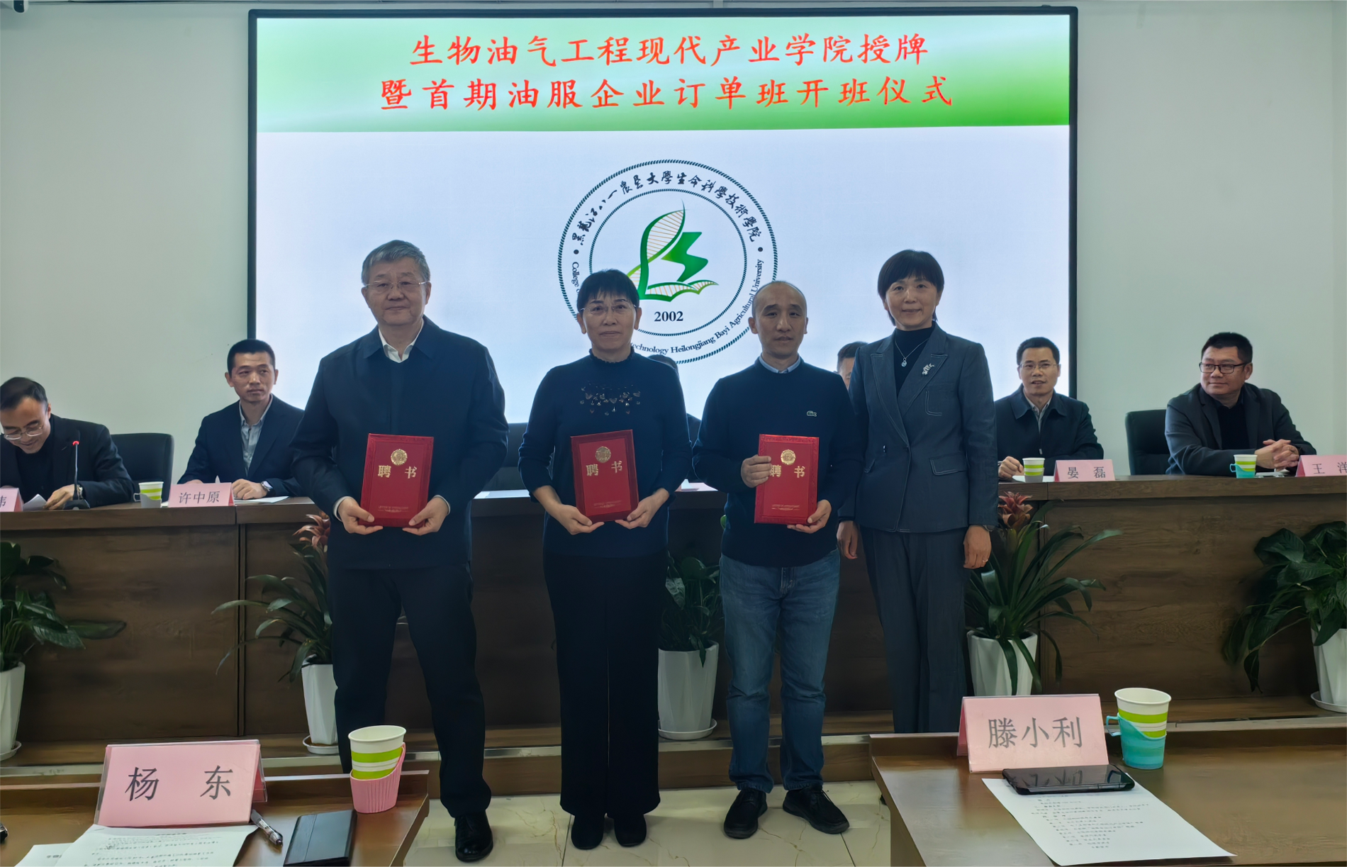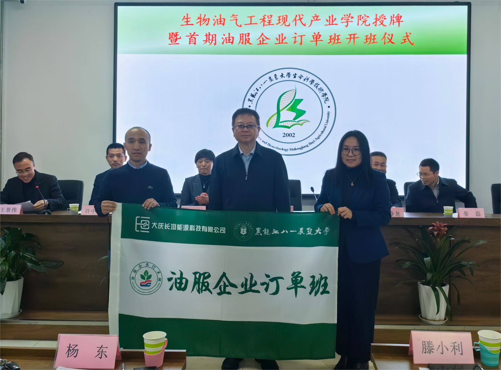 会议由王景伟主持,他指出,此次合作是落实国家生物经济发展战略、深化产教融合的重要举措,旨在通过校企协同育人,培养兼具生物技术与油气工程背景的高素质应用型人才,服务区域能源绿色转型。在授牌环节,崔卫国代表学校为“生物油气工程现代产业学院”授牌,产业学院院长晏磊接牌。随后,崔卫国为首期“油服企业订单班”授旗,大庆长垣能源副总经理滕小利、生命学院党委副书记梁平共同接旗,标志订单班正式启动。范文艳为企业导师代表颁发聘书,强化“双导师制”落地保障。